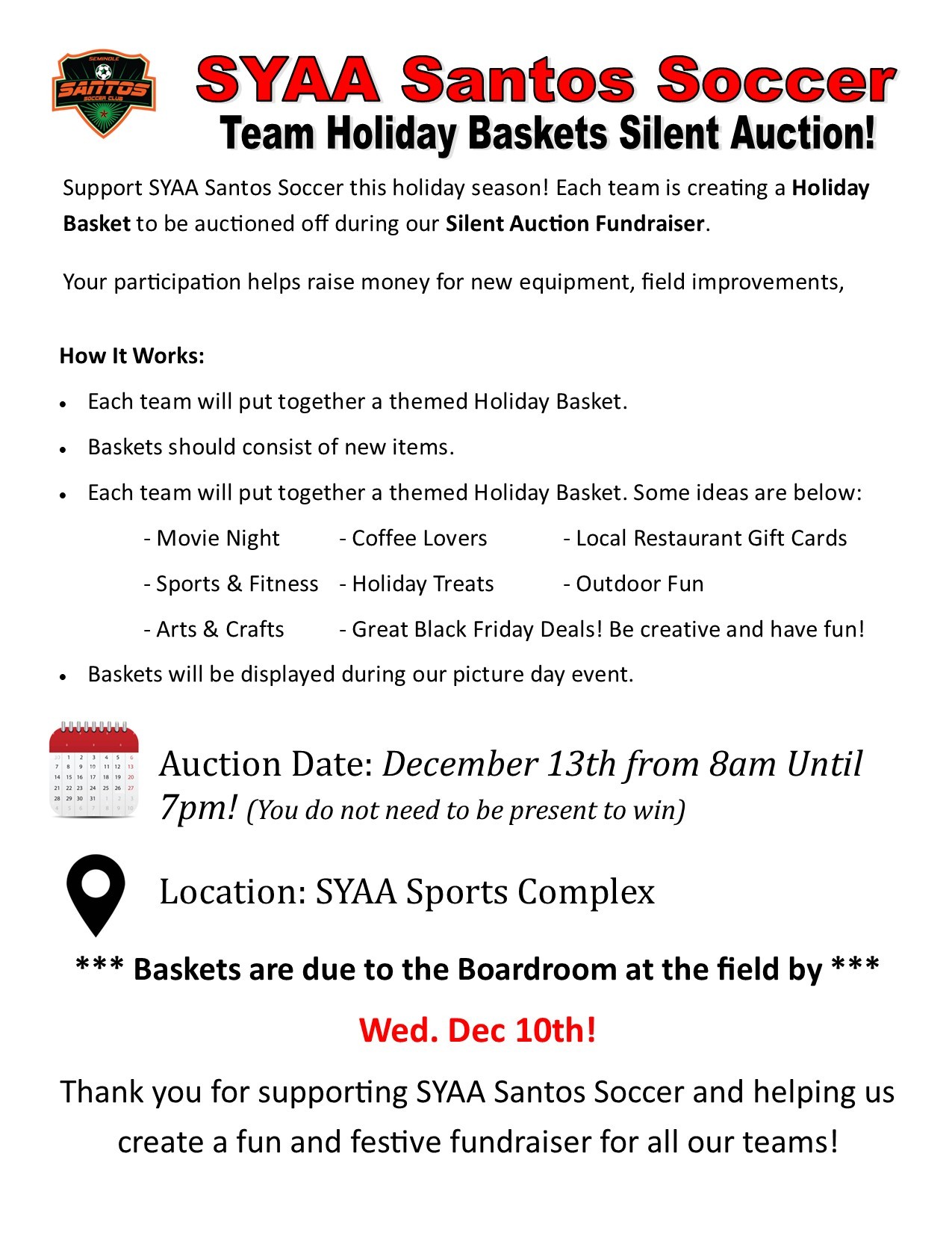 - Holiday Gift Basket Silent Auction : 8AM to 5PM